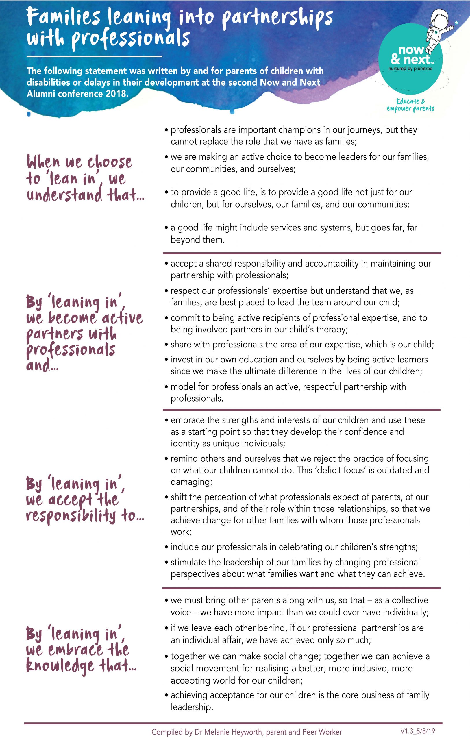 The following statement was written by and for families of children with disabilities or delays in their development during the Small steps, Giant leaps, 2018 Now & Next Alumni Conference