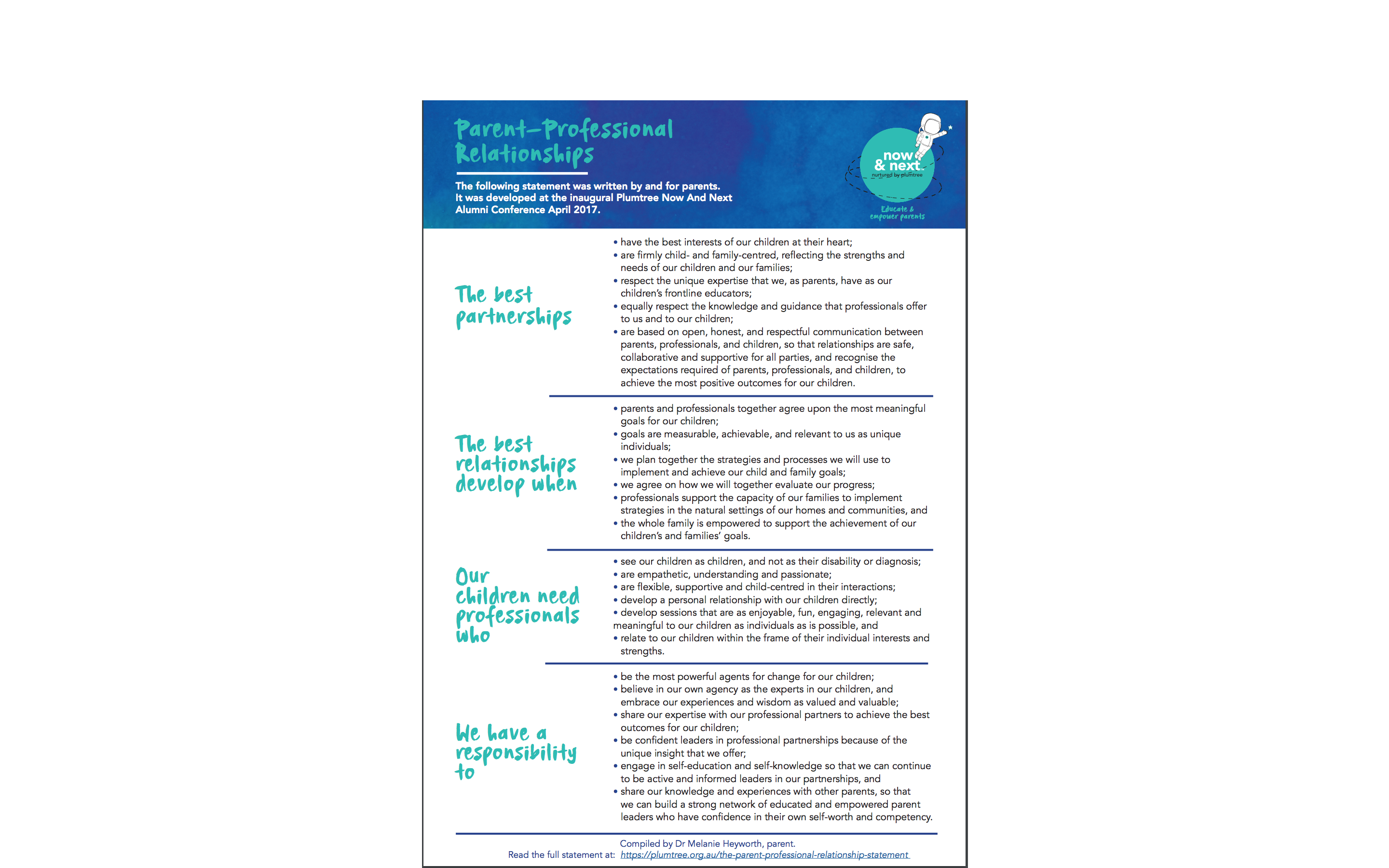 An example of this is the Parent-Professionals Relationship statement. It was collectively developed by Now and Next alumni at their first by families, for families conference, and recently launched internationally through the Citizen Network. Alumni outlined elements they believed were important in good partnerships between professionals and families. Critically, they recognized the need for families to step up in the partnership, lean in and do more to best guide and utilise professional support, so that everyone works towards the same outcome.